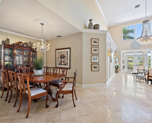 Its grand architectural features include soaring ceilings, marble flooring throughout the main living areas and extensive moldings. The covered lanai features a pool and golf course views.