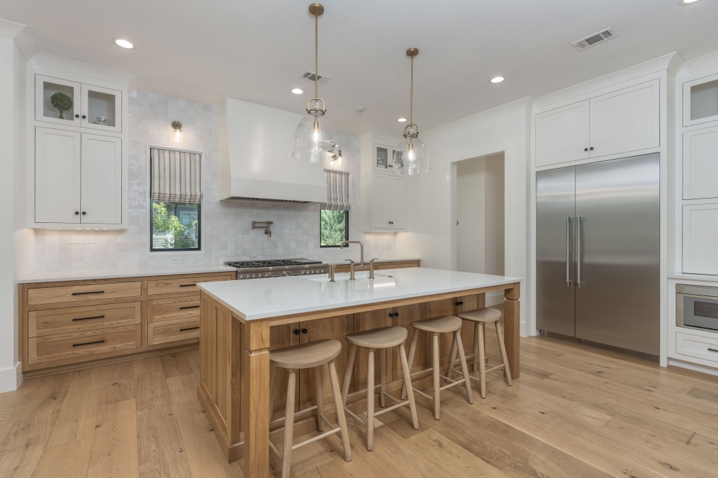 The gourmet kitchen is equipped with Thermador Professional appliances, custom cabinetry and a striking Moroccan tile backsplash.