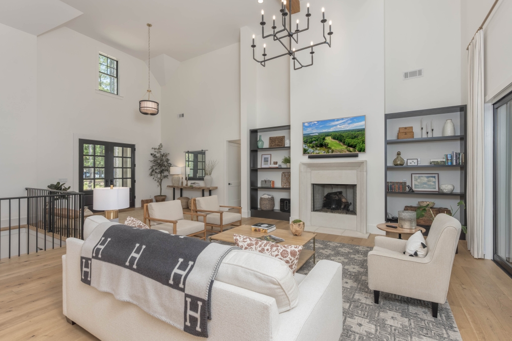 The expanded floor plan includes a main-level primary suite, soaring 20-foot ceiling, and luxury finishes like wide-plank white oak flooring and designer tile.