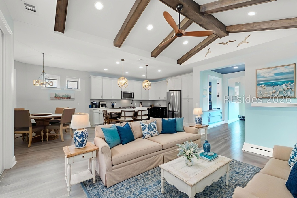 Custom details such as exposed wood beams in the great room and a coffered ceiling in the primary bedroom create a comfortable setting. Send me more about this home in Latitude Margaritaville Hilton Head!