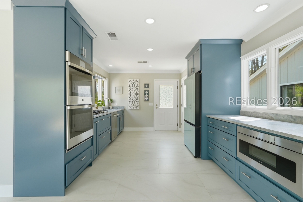 The kitchen has custom blue cabinetry, leathered quartzite countertops, stainless appliances, gas cooking and a designer hood.