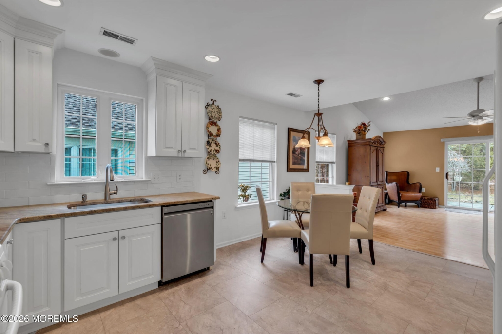 This Stratton model home at 17 Medinah Court in Westlake Golf & Country Club, NJ has a recently updated white kitchen with granite countertops and a spacious living room with a cathedral ceiling.