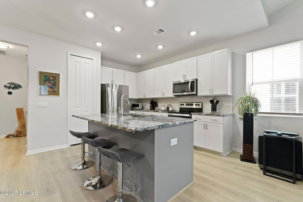 The open floor plan includes an island kitchen.