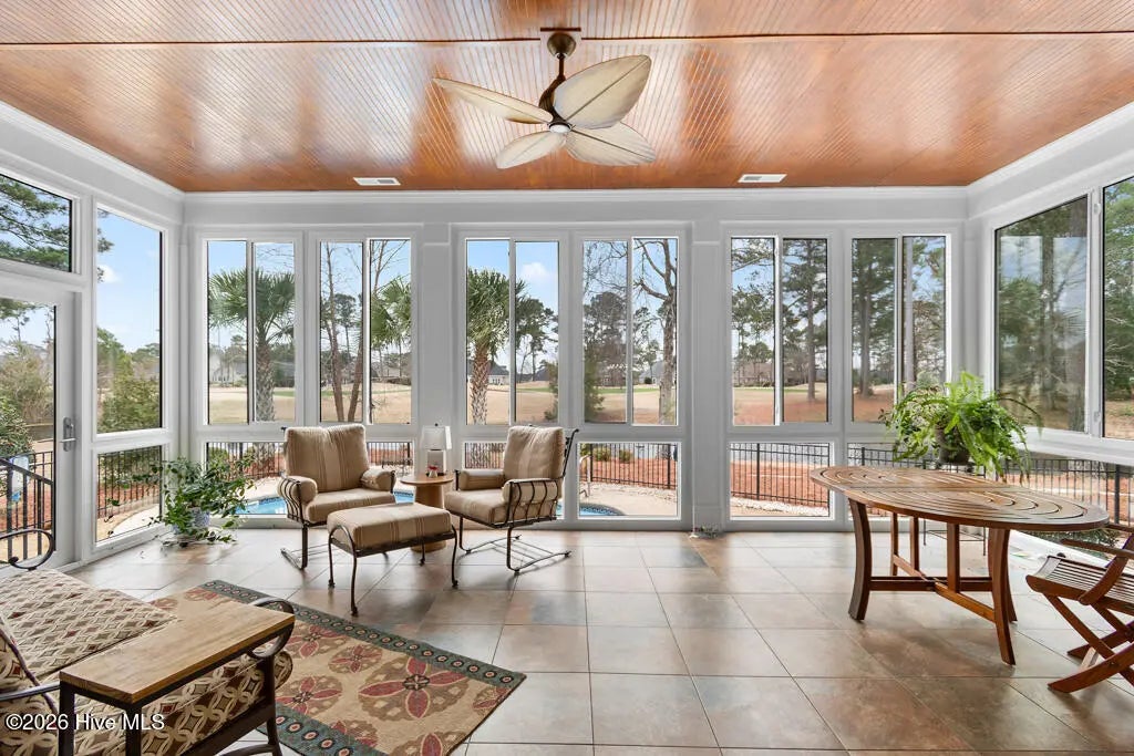 A spacious sunroom stretches across the rear of the home, overlooking the saltwater pool and fairway beyond.