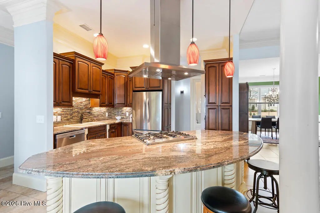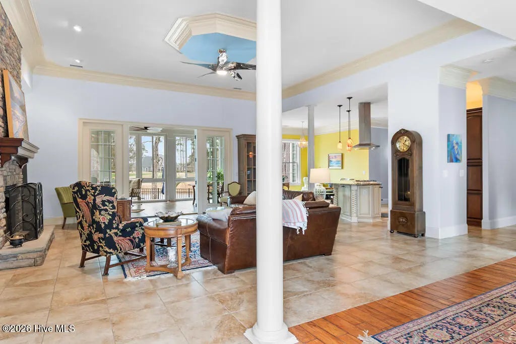 Inside, elegant tile flooring, detailed crown molding and a striking stone fireplace highlight the home’s quality craftsmanship.